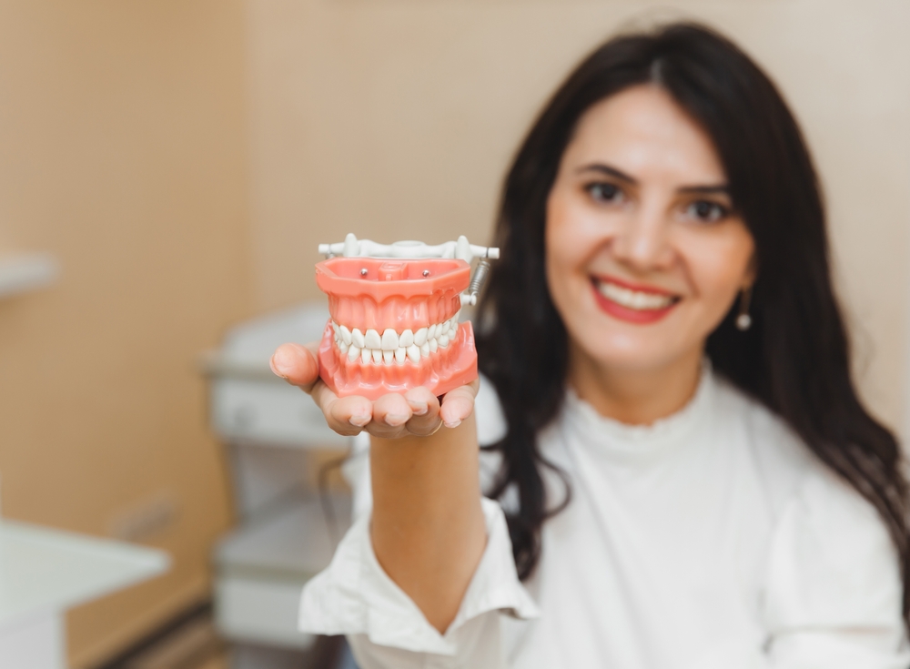 Woman,Holding,A,Tooth,Sample,Or,Denture,At,The,Dentist.